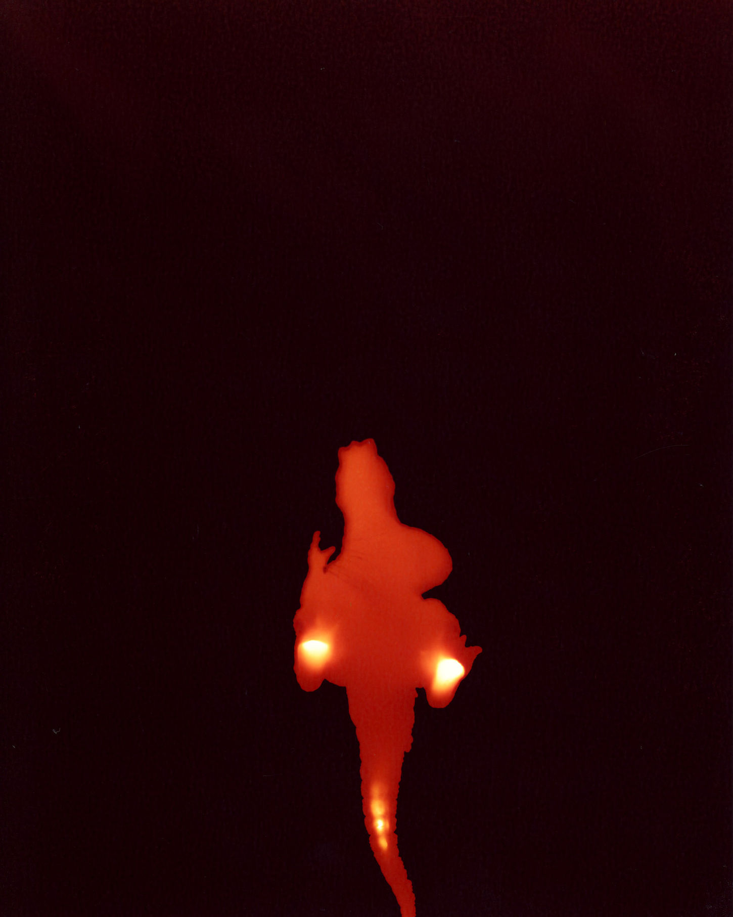 Born from the Light is a photographic meditation on mutation, memory, and the many ways a single subject can be fractured across time and perspective. Consisting of 81 C-print photograms, this series was created by exposing light-sensitive paper to sunlight and the shifting shadow of a small Godzilla toy–a figure that, for me, serves as both icon and self-portrait.