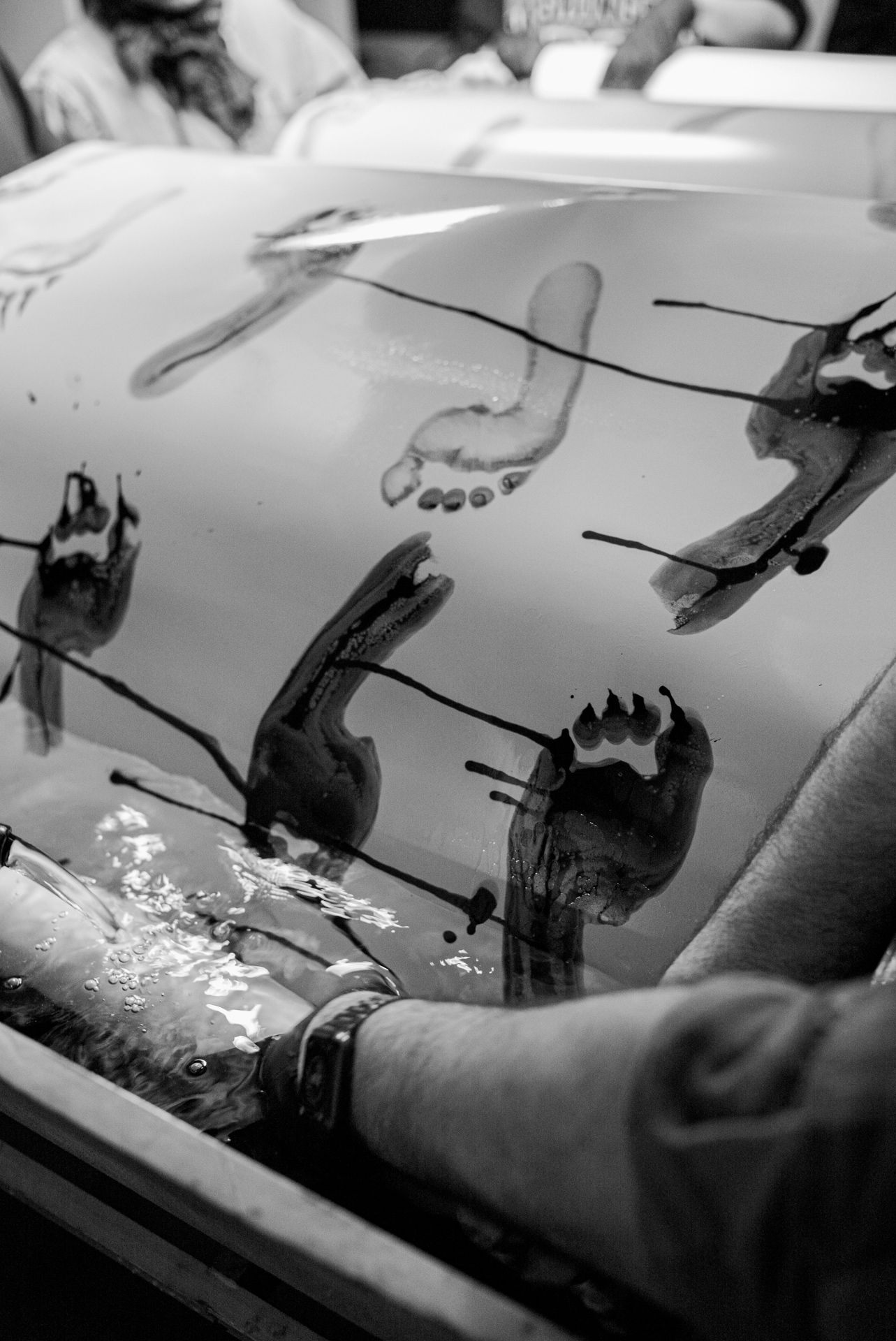 The performance involved me wearing a hazmat suit while holding an uranium glass bowl - a style of glass made with uranium popular during the 1950s - filled with photo developer and walking on B&W darkroom paper. During this walk, I took 452 steps and stopped every so often to re-dip my bare feet into the developer. The resulting image from these steps is a 100ft long black and white American flag.